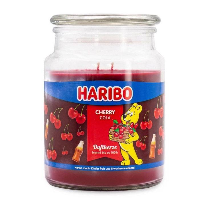 Duża świeca Cherry Cola Haribo - Słodko-owocowy zapach dojrzałych wiśni i musującej coli wprawia w dobry nastrój i nieuchronnie przypomina szczęśliwe letnie dni z delikatnymi promieniami słońca. Zrównoważony słodki i owocowy, szczególnie aromatyczny i pikantny, ten modny zapach prezentuje się sam. Owocowe nuty czarnej wiśni bawią się zuchwałymi i słodkimi niuansami śliwki, coli, słodkiego jaśminu i wanilii.