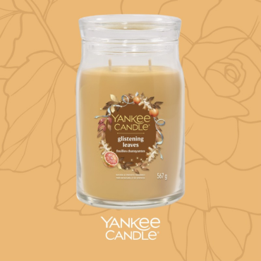 Duża świeca Signature Glistening Leaves Yankee Candle. Lśniące złote liście tańczą na chłodnym jesiennym wietrze. Zapach cierpkich cytrusów łączy się z aromatem dębowego mchu i paczuli.