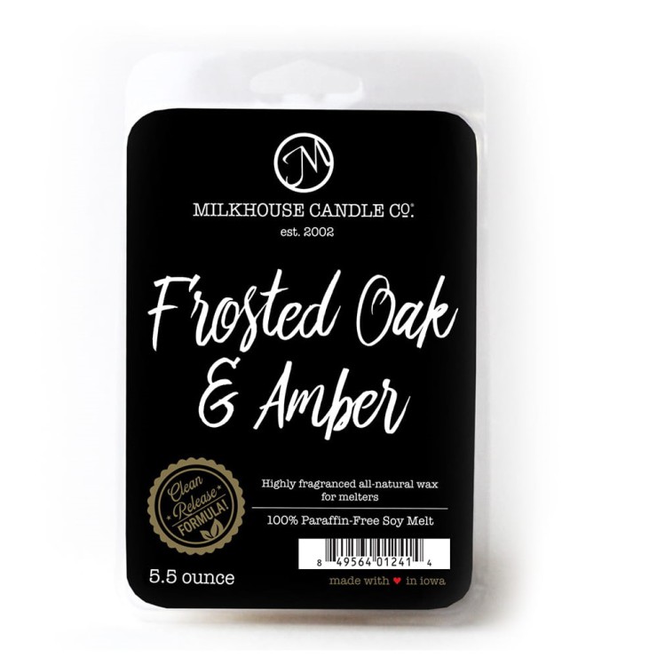 Duży wosk Frosted Oak & Amber Milkhouse Candle. Intrygujace nuty zielonej paczuli, liści wetywerii, żywicy drewna dębowego połączone ze świeżymi nutami chrupiących jabłek, odrobiny karmelu i ciepłej ambry.