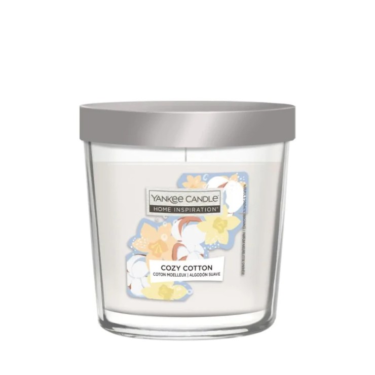 Średnia świeca Cozy Cotton Home Inspiration Yankee Candle - Ciepłe nuty bursztynu dopełnione białym pieprzem i wanilią.