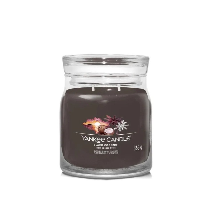 Średnia świeca Signature Black Coconut Yankee Candle - Zachód słońca w raju… kokos połączony z aromatami drzewa cedrowego i egzotycznych kwiatów.