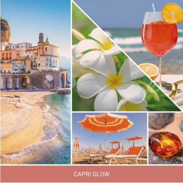 Średnia świeca Signature Capri Glow Yankee Candle - Rozkoszuj się chwilami spędzonymi na plaży gdzie nuty muśniętego słońcem bursztynu, plumerii i skórki cytrusowej łączą się w kremowy, słodki letni zapach.