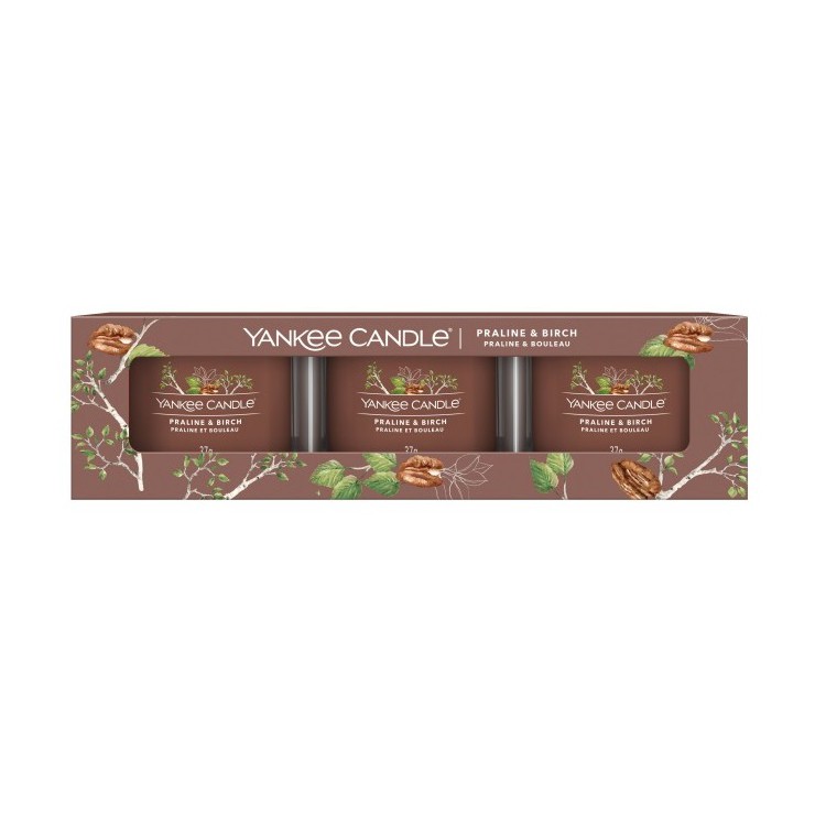 Świeca mini 3 pack Praline & Birch Yankee Candle. Aromat czekoladowych pralinek połączony z nutami drzewa sandałowego, bursztynu i wanilii.